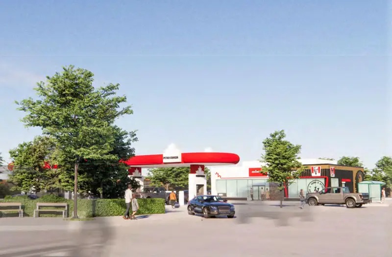 The plan calls for demolishing the existing one-storey building and replacing it with a new commercial unit on the southeast corner of the site. The proposal includes a 133 m² convenience store, a 98 m² KFC with a walk-up window, and 23 parking spaces, including eight at the gas pumps.